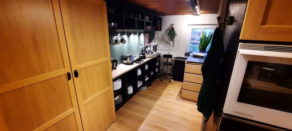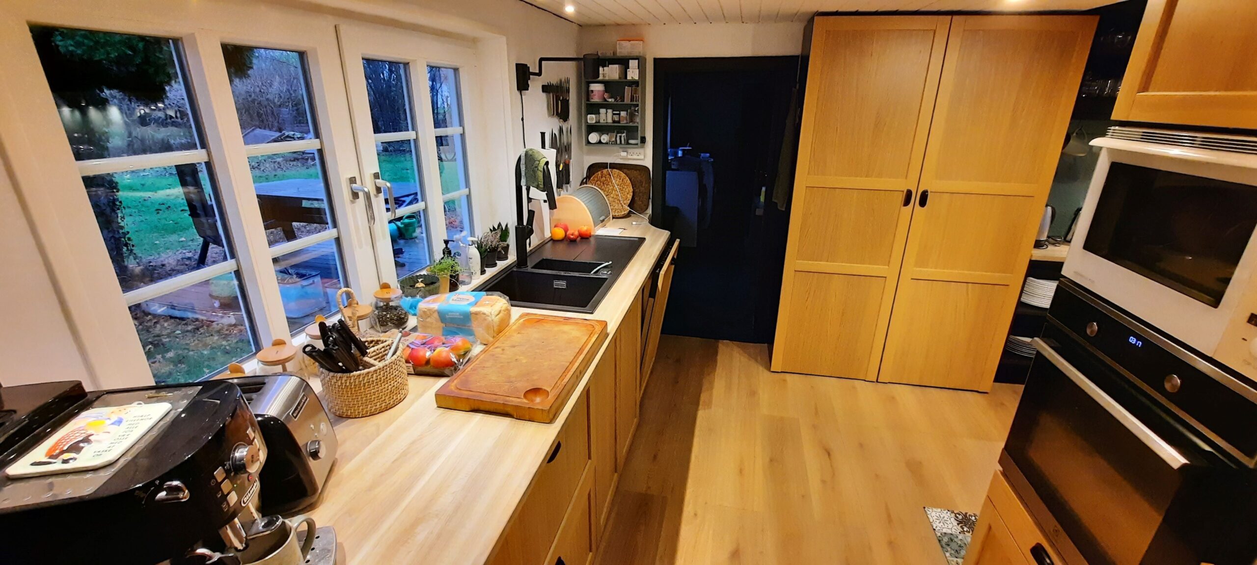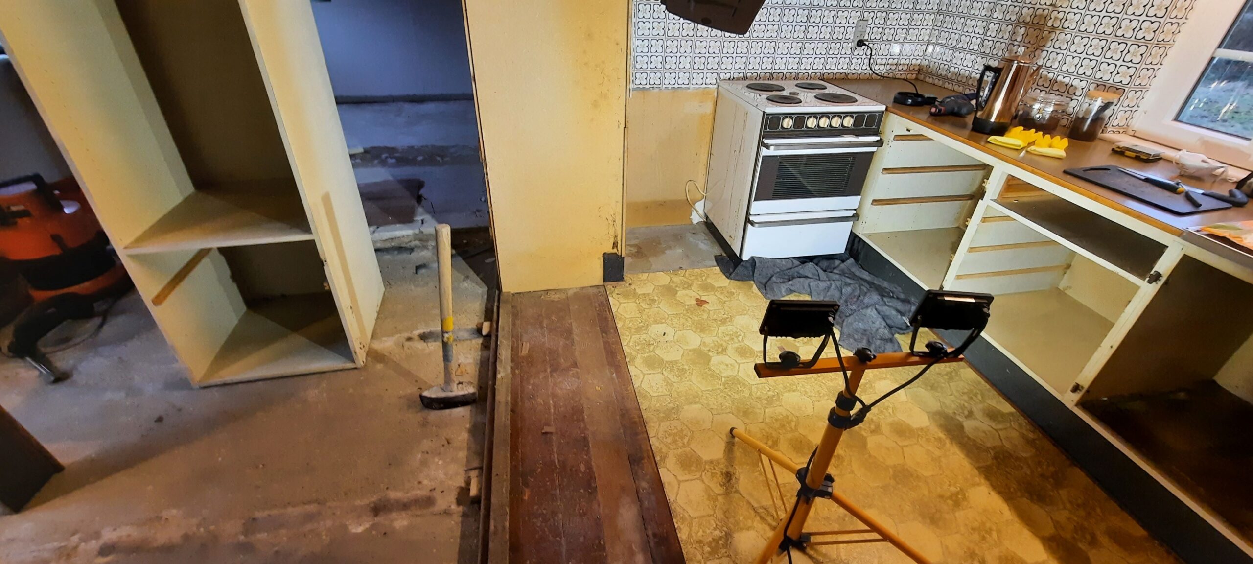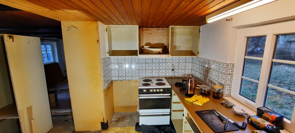 Oprindelige køkken.Nedrivningen går i gang.og nu forsvinder køkkenfunktionen.Der kom et par overraskelser frem. En halv bærende væg og en kedelig isolering.Gulvvarme og gulv på hjælper meget på udseendet.Multiplader og gipsvæg med tapet.Så kom der et køkken ud af det.Med under 2 meter til loftet er der ikke plads til sokkel og alle højskabe er skåret ned for at passe.Køkkenet fortsætter ind i spisestuen.