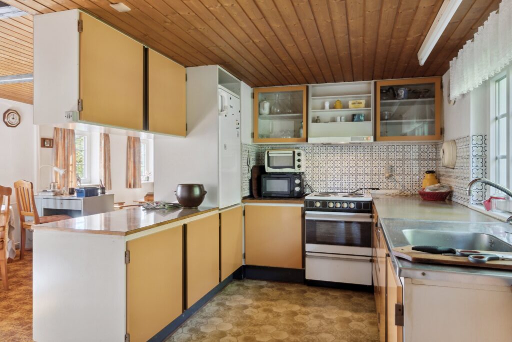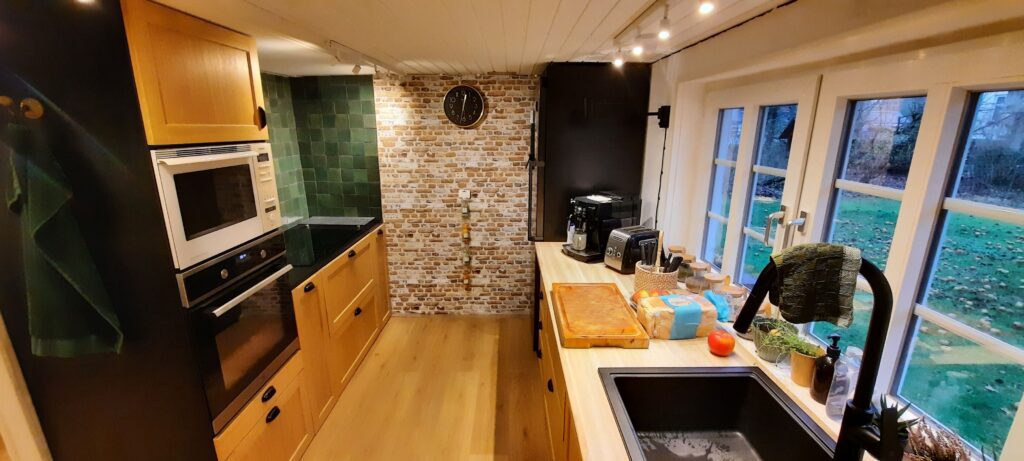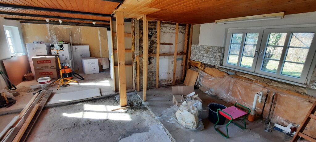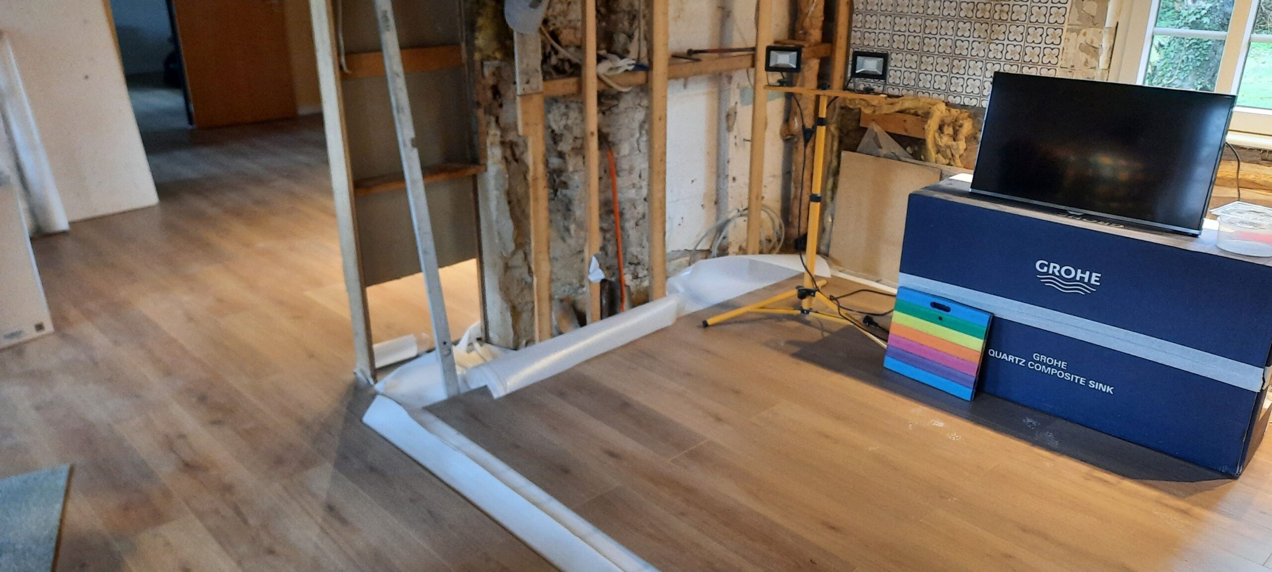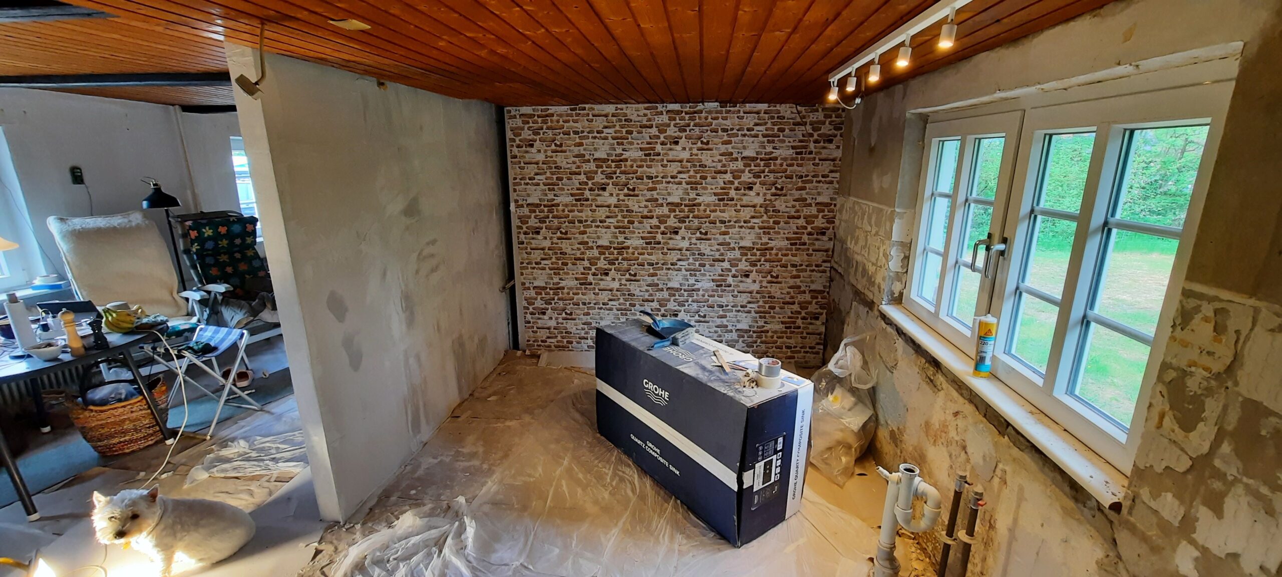 Oprindelige køkken.Nedrivningen går i gang.og nu forsvinder køkkenfunktionen.Der kom et par overraskelser frem. En halv bærende væg og en kedelig isolering.Gulvvarme og gulv på hjælper meget på udseendet.Multiplader og gipsvæg med tapet.Så kom der et køkken ud af det.Med under 2 meter til loftet er der ikke plads til sokkel og alle højskabe er skåret ned for at passe.Køkkenet fortsætter ind i spisestuen.